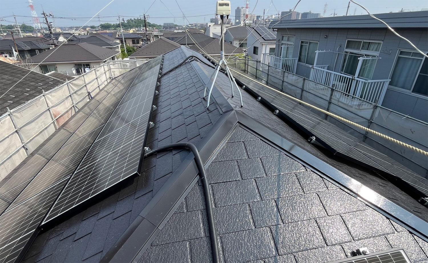 事業所兼住宅で電力消費量が多いため、屋根スペースを最大限活用して16.3kWのパネルを設置。そのうち2/3を蓄電池(16.4kW)へ、1/3を自家消費・売電に回す構成にしました。 施工面では、リフォーム部門と連携し、太陽光設置前に屋根の遮熱塗装を行い、さらにパネルが屋根を覆うことで「日傘効果」を生み出し、2階リビングの暑さ対策を強化。さらに、西日の強い窓には断熱内窓を設置し、冷暖房効率を改善しました。金利0円のリフォームローンを活用いただくことで、初期費用の負担を抑えつつ理想の設備を実現しました。